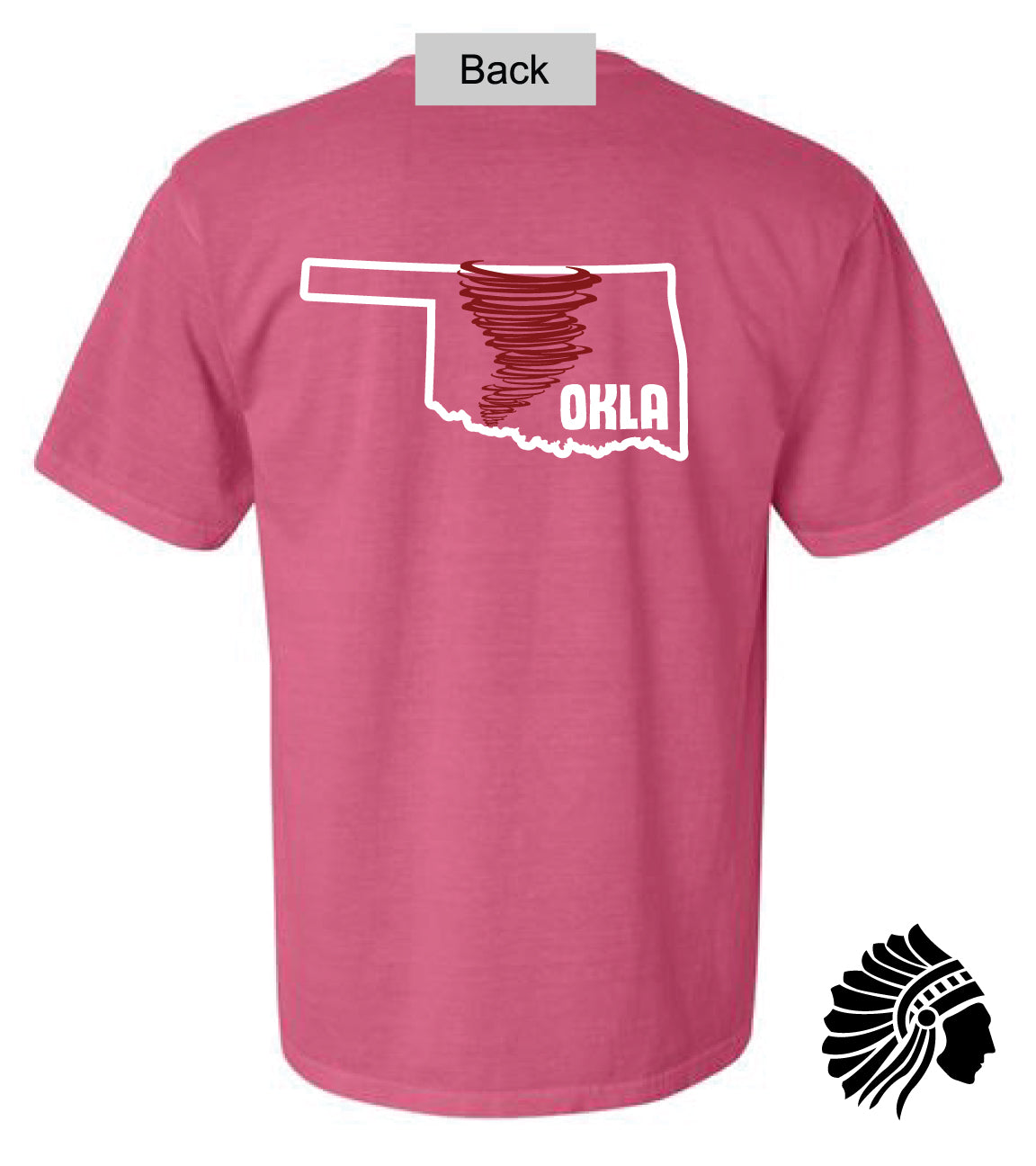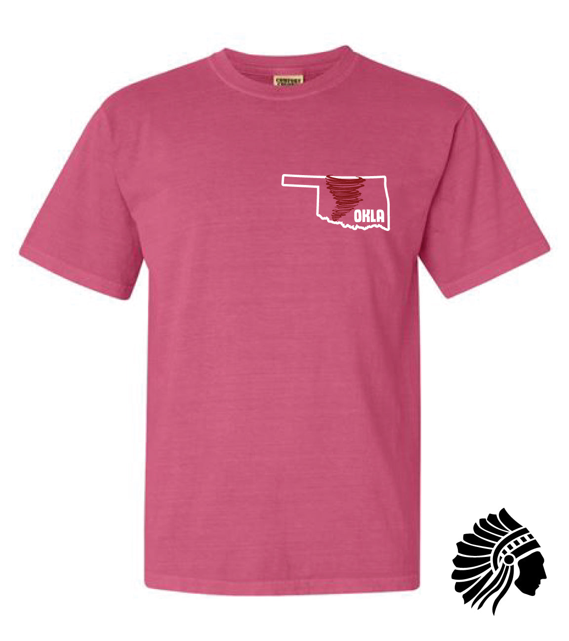 Oklahoma Tornado Crunchberry Comfort Colors Adult Heavyweight tee shirt, featuring a relaxed fit. Designed and screen printed by The Native Screen Prints in Bartlesville, Oklahoma.