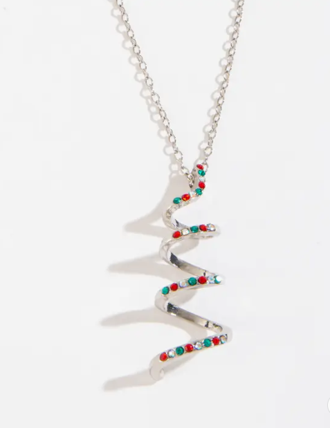 Add a touch of glam to your holiday wardrobe with the Juniper Swirl Pendant Necklace. With a delicate modern swirl pendant featuring red, green, and Aurora Borealis toned faceted stones, this necklace adds a subtle pop of holiday cheer to any outfit.