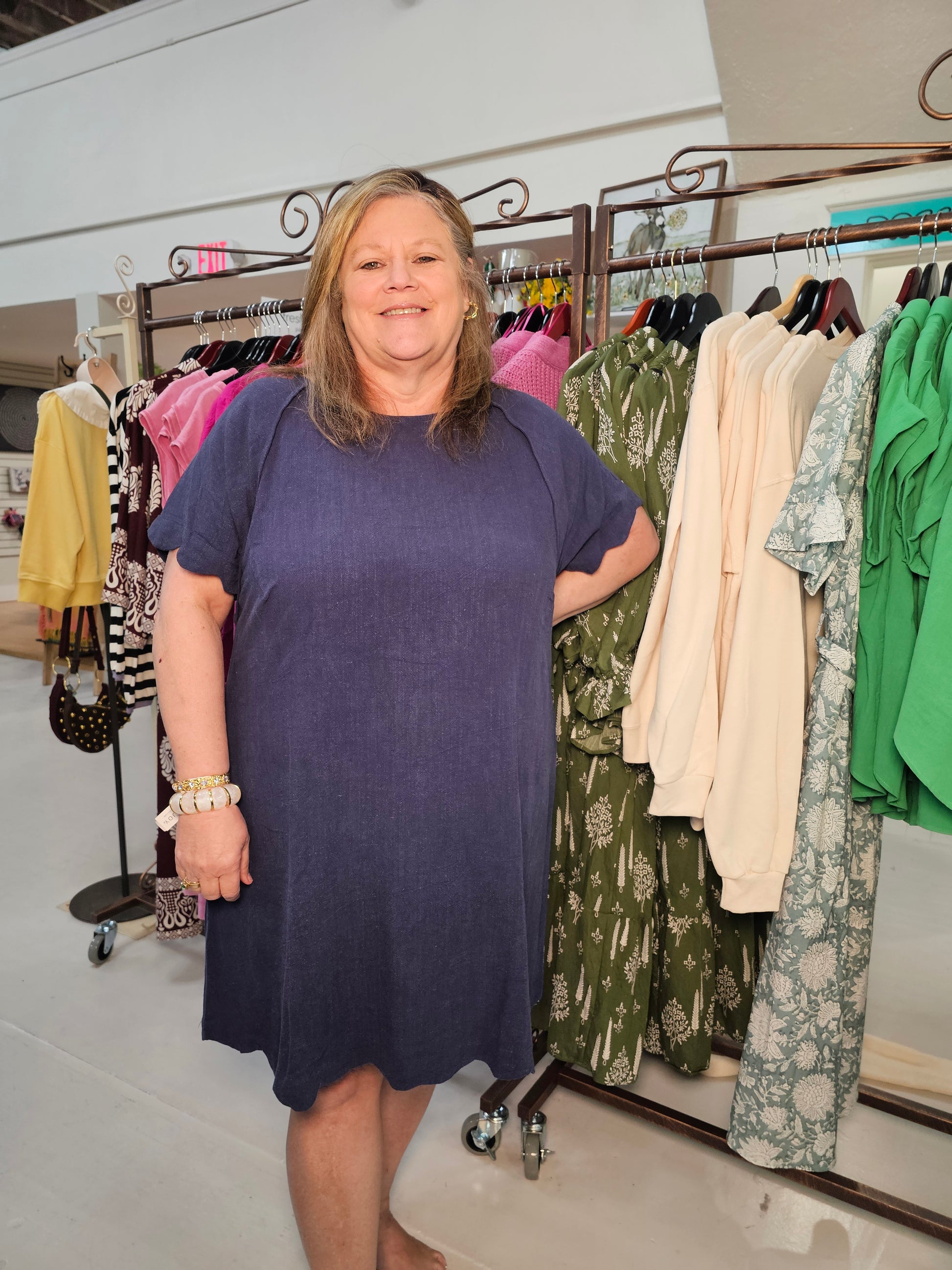 Relaxed elegance in a breathable linen blend. This dress features a rounded neckline and short dolman sleeves finished with delicate scalloped edges. Effortlessly versatile and, of course, it has pockets.