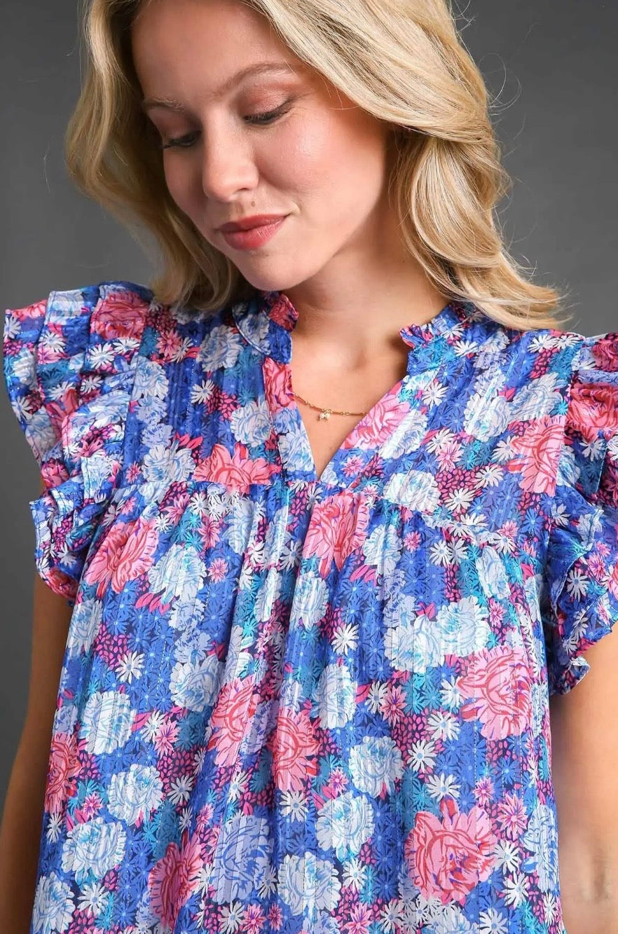 Blue and pink floral print dress.